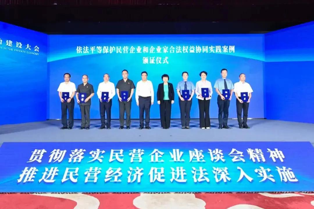 大会展示了最高人民法院、最高人民检察院、司法部、中国法学会和全国工商联深入学习贯彻习近平总书记在民营企业座谈会上的重要讲话精神,扎扎实实落实各项政策法规,以高质量法治护航民营经济高质量发展的生动实践,发布了2025推进民营经济法治建设十大实事,依法平等保护民营企业和企业家合法权益系列典型案例,依法平等保护民营经济合法权益研究报告(2025)及依法平等保护民营企业和企业家合法权益协同实践案例,《法治民企行动方案(2021—2025年)》落实情况报告及商会、民营企业推进法治民企建设典型做法,举行了协同实践案例单位代表颁证仪式。全国工商联咨询委员会委员、浙江传化集团有限公司董事长徐冠巨宣读了“完善企业治理 坚定走高质量发展之路——建立完善中国特色现代企业制度”倡议书,全国工商联副主席、安踏集团董事局主席丁世忠,中国民间商会副会长、小米科技有限责任公司董事长雷军围绕学习总书记重要讲话精神和民营经济促进法作交流发言。