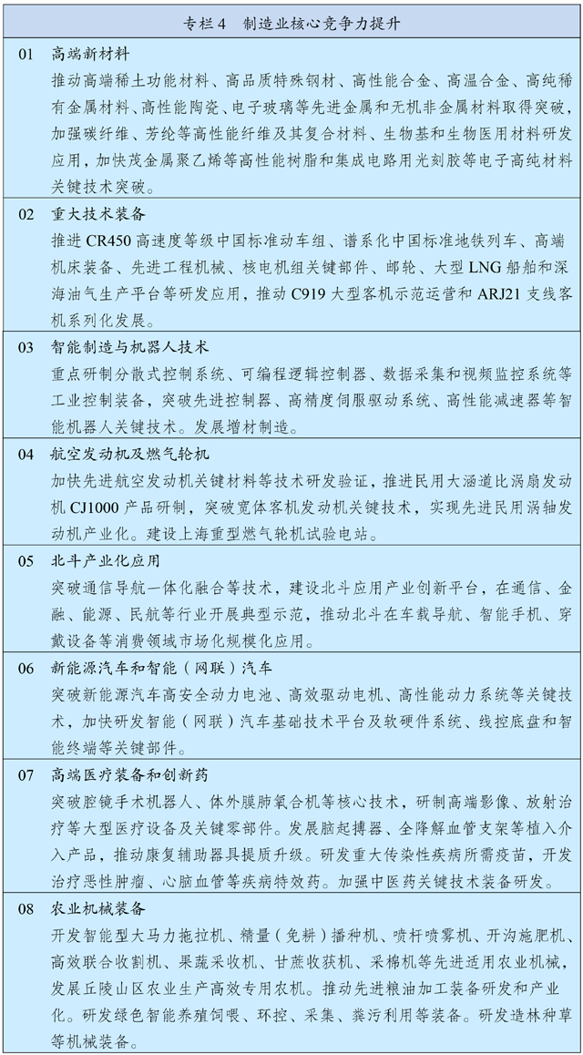 深入实施智能制造和绿色制造工程,发展服务型制造新模式,推动制造业高端化智能化绿色化。培育先进制造业集群,推动集成电路、航空航天、船舶与海洋工程装备、机器人、先进轨道交通装备、先进电力装备、工程机械、高端数控机床、医药及医疗设备等产业创新发展。改造提升传统产业,推动石化、钢铁、有色、建材等原材料产业布局优化和结构调整,扩大轻工、纺织等优质产品供给,加快化工、造纸等重点行业企业改造升级,完善绿色制造体系。深入实施增强制造业核心竞争力和技术改造专项,鼓励企业应用先进适用技术、加强设备更新和新产品规模化应用。建设智能制造示范工厂,完善智能制造标准体系。深入实施质量提升行动,推动制造业产品“增品种、提品质、创品牌”。